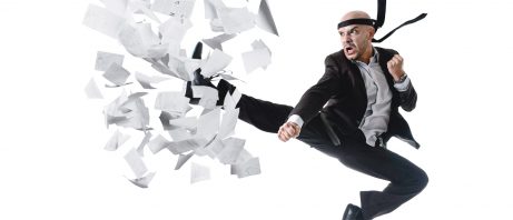funny aggressive businessman in kung fu kick karate flying attack