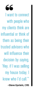 Steve Epstein, CRS, senior partner and sales agent at the Epstein Partners, Keller Williams Realty, in Montecito/Santa Barbara, California, and a real estate veteran of nearly 37 years, says, “I want to connect with people who my clients think are influential or think of them as being their trusted advisors who will influence their decision by saying, ‘Hey, if I was selling my house today, I might call him.’”