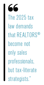 The 2025 tax law demands that REALTORS® become not only sales professionals, but tax-literate strategists. These changes are not superficial tweaks; they redefine the calculus of what makes a transaction, investment or deduction viable. For practitioners who rise to the challenge, this moment offers a path to elevated relevance. For those who don’t, the cost will be more than tax; it could mean obsolescence. For detailed information and to learn more about the new tax implications, register for the CRS course Tax Strategies for the Real Estate Professional.